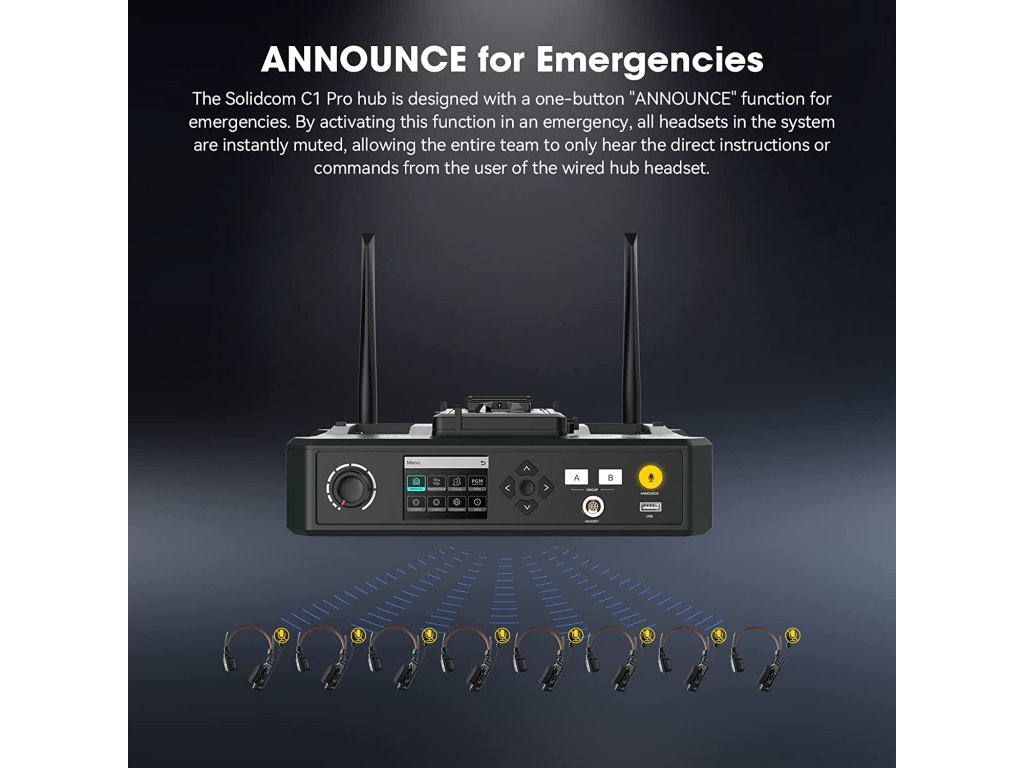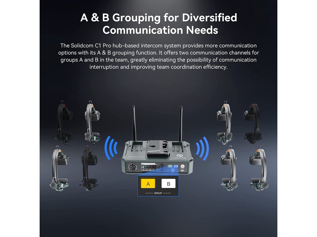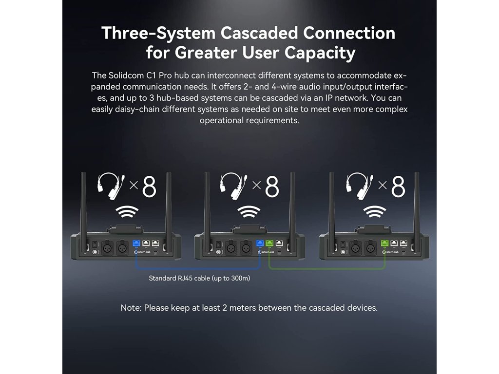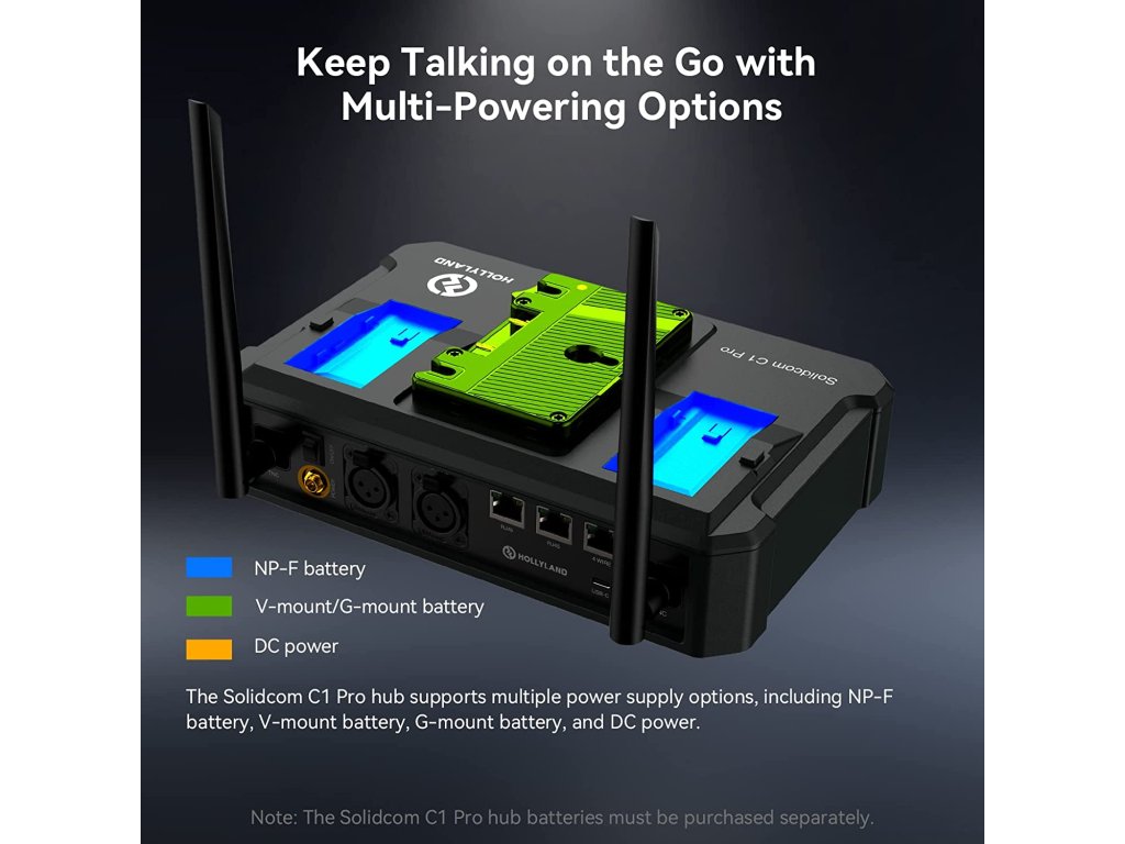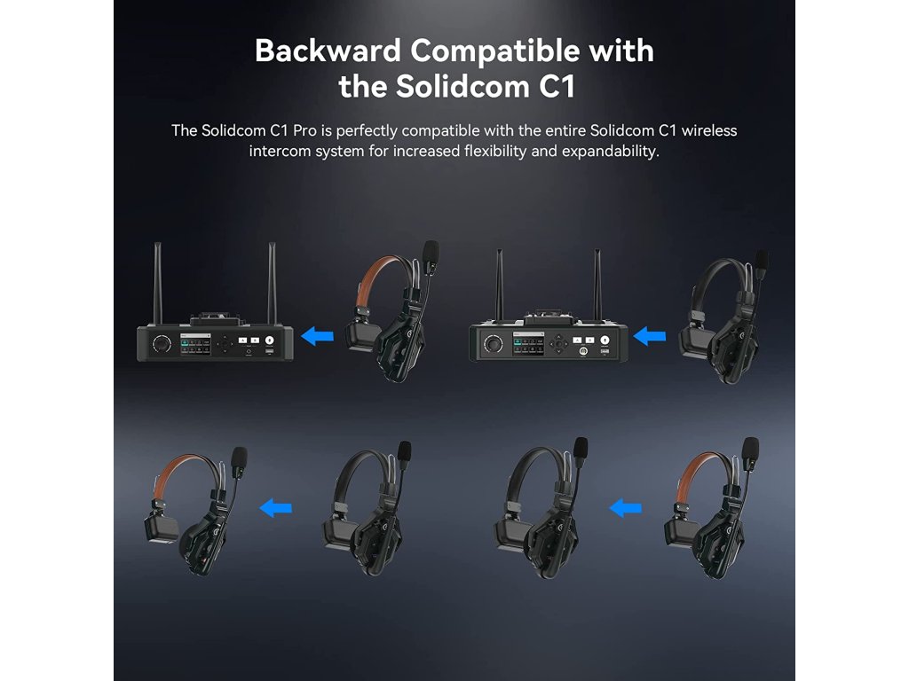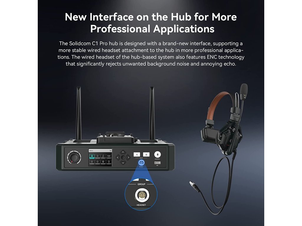 Hollyland Solidcom C1 Pro je plne duplexný bezdrôtový interkom pracujúci v pásme 1,9 GHz (DECT 6.0) s dosahom až 350 m (priama viditeľnosť). Integráciou všetkých komponentov do náhlavnej súpravy ponúka maximálne pohodlie a jednoduchú prenosnosť bez ďalších opaskov alebo základňových staníc. Headset váži cca. 170 g a dodáva sa s náhradnou batériou pre nepretržitú prevádzku, bez výpadkov. Interkom Solidcom C1 Pro ponúka prenos zvuku vo frekvenčnom rozsahu 150 Hz - 7 kHz, technológiu AEC (Acoustic Echo Cancellation), smerový mikrofón pre potlačenie okolitého hluku, prídavný všesmerový mikrofón pre detekciu okolitého hluku a Environmental Noise Cancellation (ENC; možno deaktivovať) , Push-to-Talk ovládanie, šifrovanie prenosu atď. Dodáva sa v niekoľkých variantoch ako sada pre dvoj až šesťčlenné tímy.