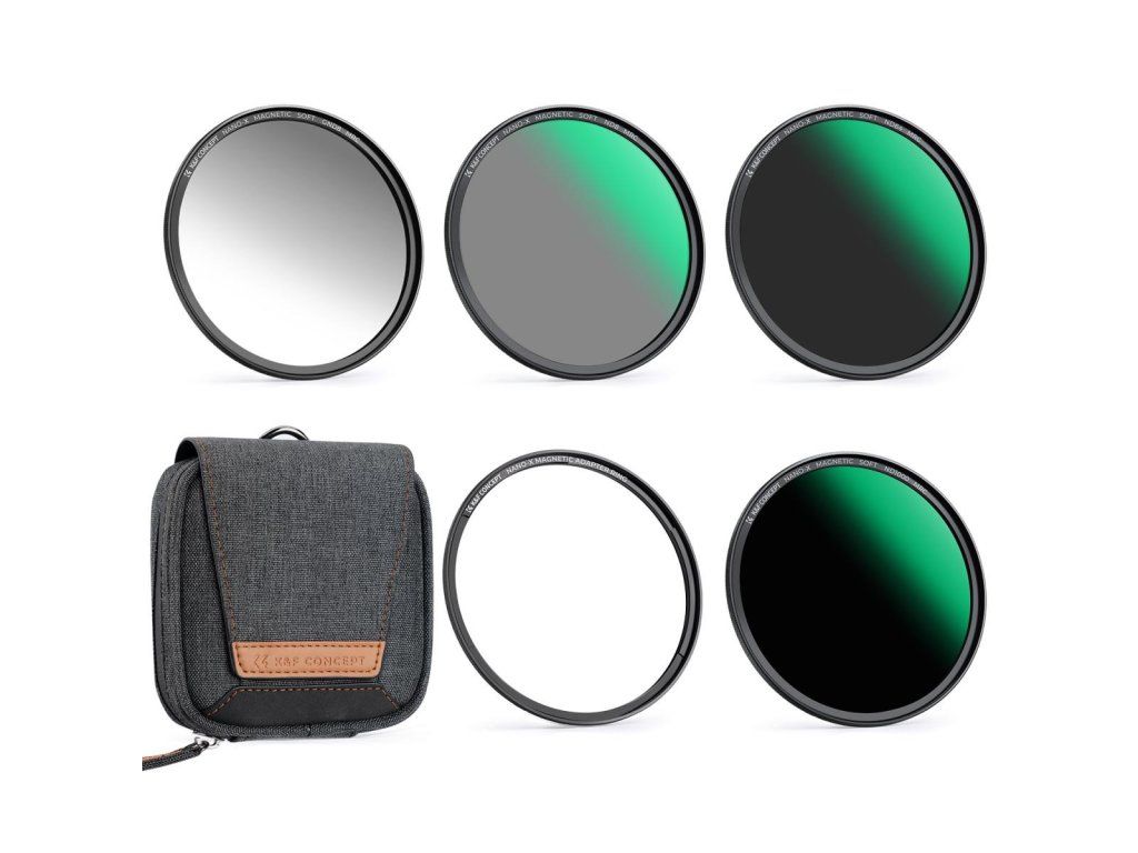 StránkaK&F Concept 77mm magnetický 5-dielny filter Kit zahŕňaFiltre GND8, ND8, ND64 a ND1000 plus magnetický adaptérový krúžok, ktorý ponúka okamžitú výmenu filtra za 1 sekundu, prémiové viacvrstvové optické sklo AGC a ultratenký rám bez vinetácie – ideálny pre krajinársku fotografiu a fotografiu s dlhou expozíciou.