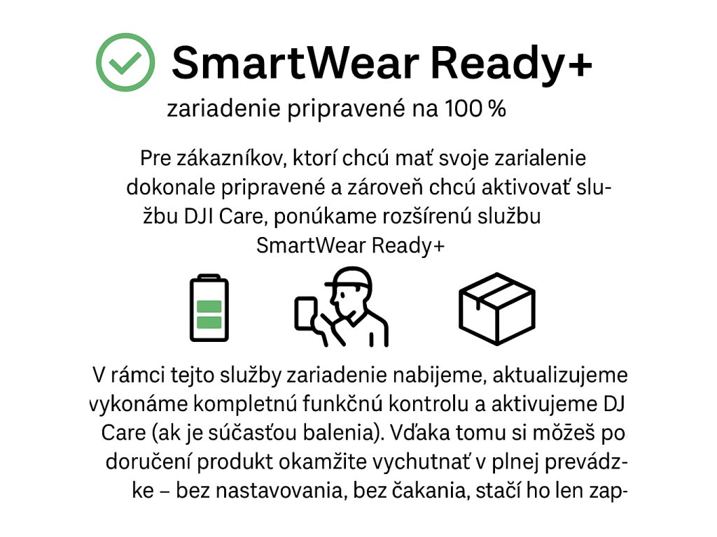 Pre tých, ktorí chcú mať všetko dokonale pripravené a chcú aj aktivovať službu DJI Care, ponúkame aj rozšírenú službu SmartWear Ready+. V rámci nej zariadenie nabi jeme, aktualizujeme a skontrolujeme všetky funkcie, aby bolo po doručení ihneď pripravené na použitie – stačí ho len zapnúť.