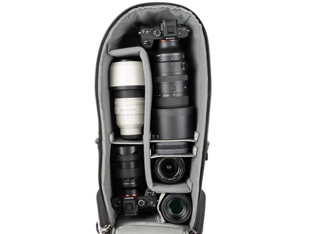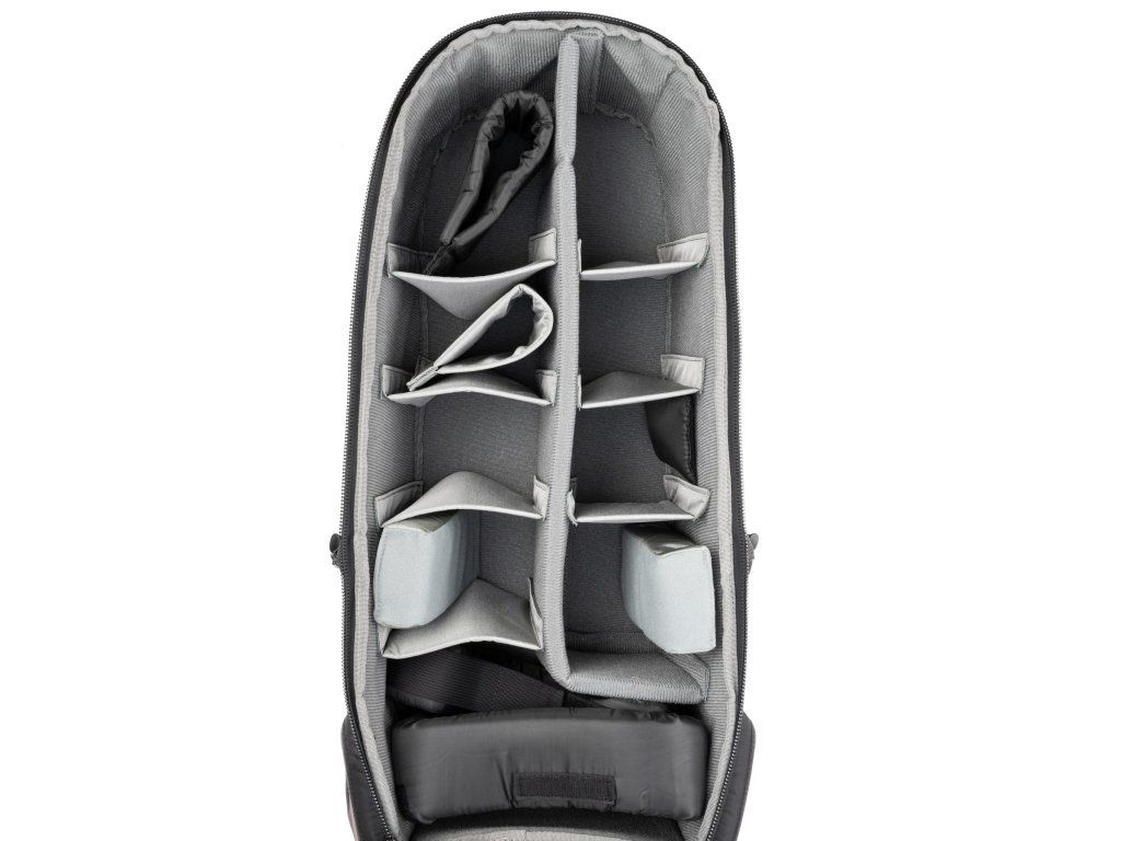 - Variabilný vnútorný priestor – plne polstrované a nastaviteľné prepážky umožňujú prispôsobiť usporiadanie aktuálnej zostave fotovýbavy.