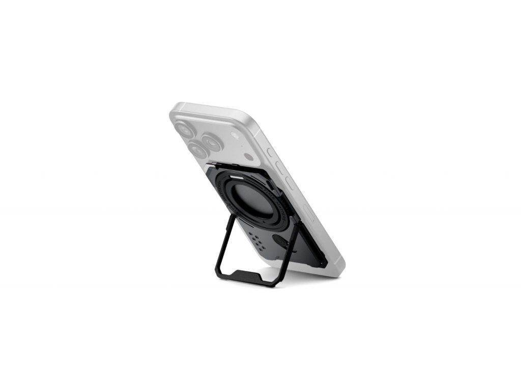 Multifunkčný magnetický zadný kryt Tilta Khronos, navrhnutý špeciálne pre iPhone 17 Pro (kompatibilný aj s iPhone 15 a 16 Pro/Pro Max), sa magneticky pripevňuje priamo k vášmu smartfónu bez potreby puzdra. Je vybavený robustným nastaviteľným stojanom, ktorý je užitočný pre používanie bez použitia rúk na rovnom povrchu, vertikálne aj horizontálne.
